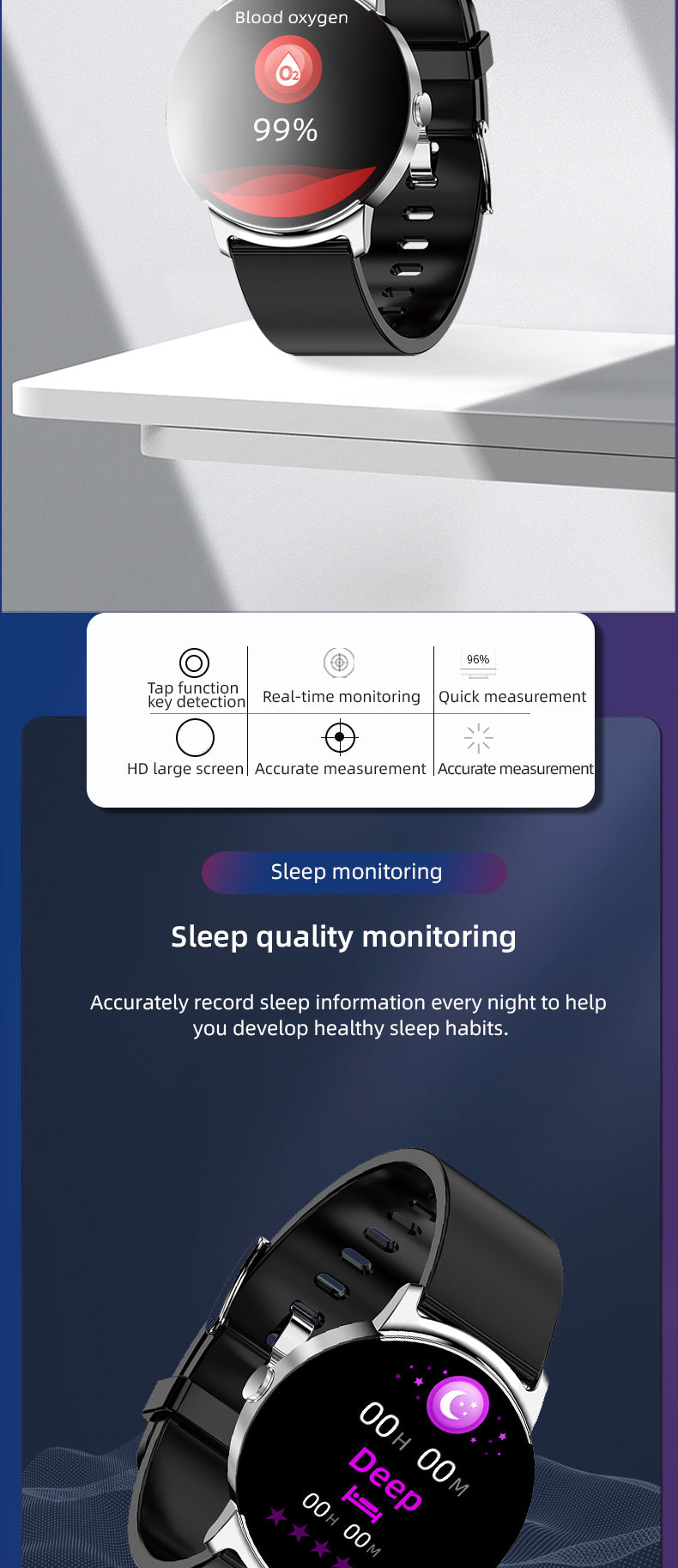 - In-Depth Physical Health Monitoring: The smartwatch offers detailed tracking of various health indicators such as heart rate, blood pressure, sleep quality, step count, and calories burned. By continuously monitoring these metrics, it helps you better understand your body, set personalized health goals, and maintain a balanced lifestyle.